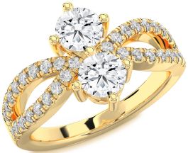 This exquisite promise ring showcases a dazzling duet of round-cut stones—one brilliant white and one deep royal blue—nestled in classic prong settings. Crafted in lustrous yellow gold, the split shank design is adorned with pavé-set diamonds that gracefully loop around the center, creating a captivating symbol of commitment and shared journeys ahead.