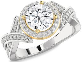 A brilliant round center is encircled by a radiant halo, creating a focal point of timeless allure. The band weaves gracefully around the setting in a layered embrace, adorned with shimmering accents that catch the light from every angle. Bold yet refined, this Engagement Ring symbolizes the elegant intertwining of two paths into one unforgettable journey of love and commitment.