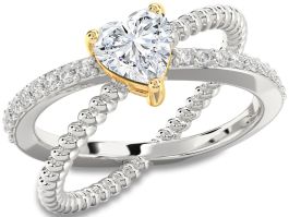 Boldly modern yet beautifully romantic, this engagement ring features a heart-shaped centerpiece perched between two contrasting bands—one shimmering with brilliance, the other sculpted in a twisted rope design. Their crossing paths create a striking sense of motion and unity. A celebration of individuality and connection, this ring embodies love with a contemporary twist.