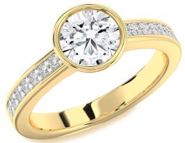 A brilliant round center stone is securely nestled in a smooth bezel setting, offering a sleek and contemporary look. The band is adorned with a row of sparkling accents, adding understated elegance and a graceful shimmer. With its clean lines and refined silhouette, this Engagement Ring embodies sophistication and strength—perfect for a love that’s bold, enduring, and beautifully effortless.