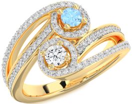 This radiant promise ring features a brilliant design with two dazzling round gemstones—one baby blue and one pink—each surrounded by a sparkling halo of accent stones. The yellow gold band gracefully splits and curves, encrusted with pavé-set diamonds for added shimmer. Symbolizing unity and everlasting love, this promise ring is a heartfelt expression of commitment.