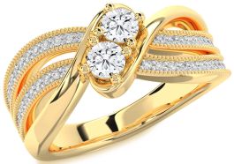 This elegant promise ring features two radiant round gemstones—one a delicate pink and the other a brilliant blue—symbolizing love and unity. Set in shimmering yellow gold, the bypass-style band is adorned with multiple rows of pavé-set diamonds bordered by intricate milgrain accents. The graceful crossover design makes this promise ring a beautiful and meaningful statement of commitment.