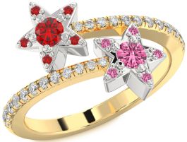 This celestial-inspired promise ring shines in yellow gold with two dazzling star-shaped settings, each adorned with a vibrant round-cut center stone—one white, one purple—surrounded by brilliant accent diamonds. The double-row diamond band adds extra sparkle, making this promise ring a radiant symbol of love and shared dreams. A truly enchanting expression of connection.