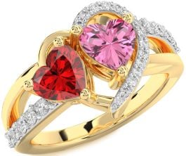 This elegant Promise Ring features two stunning heart-shaped stones set in a polished yellow gold band. Surrounding each gemstone is a sweeping arc of round-cut diamonds, adding radiant shimmer. The split-shank design offers a modern twist, while the dual-heart motif symbolizes love, connection, and unity. A perfect expression of romance and timeless elegance.
