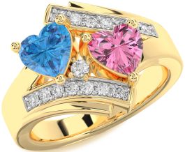 Bold and elegant, this double-heart Promise ring features two striking heart-shaped stones cradled between parallel rows of shimmering accent gems. The geometric setting adds a modern edge, while a round center stone anchors the composition with refined brilliance. The layered band design conveys strength and depth, making this piece a captivating symbol of unity and enduring affection.