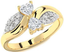 This romantic promise ring showcases two heart-shaped gemstones—one sparkling white and one vibrant purple—nestled side by side in a symbolic embrace of love and connection. Set in radiant yellow gold, the design is accented by clusters of round brilliant diamonds on each shoulder, creating a shimmering backdrop. A perfect promise ring to represent shared affection and enduring devotion.