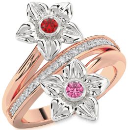 This exquisite floral-inspired promise ring features two intricately sculpted golden blossoms, each centered with a vibrant gemstone—one radiant red and the other brilliant white. The gracefully curved yellow gold band is adorned with a sparkling row of pavé-set accent stones, adding a luxurious touch. A meaningful promise ring symbolizing eternal love, devotion, and blooming unity.