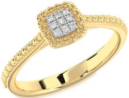 This charming yellow gold Promise ring features a cushion-shaped head adorned with a cluster of round-cut diamonds arranged in a grid pattern, offering a sparkling centerpiece. The surrounding gold frame is delicately engraved with star motifs, enhancing the vintage aesthetic. The shank is accented with beaded detailing, adding texture and character to this elegant and romantic design.