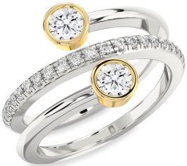 This elegant promise ring showcases a captivating dual-band design featuring a sparkling white and a radiant pink round gemstone in secure bezel settings. One band gleams in polished gold, while the other dazzles with a row of pavé-set accent stones, symbolizing a bond filled with clarity and love. A modern yet sentimental choice, perfect for a heartfelt promise.
