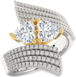 This lavish Promise Ring commands attention with two heart-shaped center stones embraced by a bold, contemporary design. One side of the band features twisted gold ropes, while the other showcases five rows of glittering pavé-set accent stones. The contrasting textures create dynamic visual movement, making this piece a perfect blend of romance and sophistication.