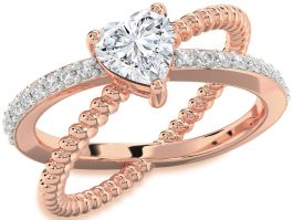 Boldly modern yet beautifully romantic, this engagement ring features a heart-shaped centerpiece perched between two contrasting bands—one shimmering with brilliance, the other sculpted in a twisted rope design. Their crossing paths create a striking sense of motion and unity. A celebration of individuality and connection, this ring embodies love with a contemporary twist.