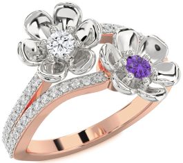 Diamond Rose Gold Silver Flower Round Two Stone Promise Ring