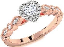This elegant promise ring features a radiant heart-shaped centerpiece encircled by a shimmering halo of round stones, exuding timeless grace. The intricately designed band, adorned with alternating marquise motifs and delicate milgrain detailing, adds vintage charm. Meticulously crafted, it symbolizes enduring love and commitment with every sparkling facet.