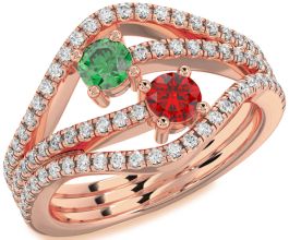 This bold and captivating promise ring features two round-cut birthstones—one in vibrant emerald green and the other in passionate ruby red—symbolizing unity in diversity. Set against a brilliant yellow gold backdrop, the crisscrossing band is encrusted with shimmering diamonds, adding layers of sparkle and depth. A heartfelt token of eternal commitment and colorful devotion.