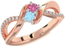 This stunning promise ring features a graceful infinity-style bypass design in radiant yellow gold. At the heart of the ring, two round-cut gems—one soft pink and the other icy blue—are cradled in prong settings, symbolizing unity and enduring love. A line of pavé-set diamonds arcs along the split band, adding brilliance and depth to this meaningful symbol of your everlasting bond.