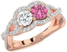 This elegant promise ring features two dazzling round stones—one clear white and the other a vivid pink—nestled side by side, symbolizing unity and love. Surrounded by a double halo of sparkling pavé diamonds and set in a luxurious yellow gold band, the design radiates timeless romance and commitment, making it a perfect token of your enduring promise.