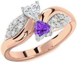 This romantic promise ring showcases two heart-shaped gemstones—one sparkling white and one vibrant purple—nestled side by side in a symbolic embrace of love and connection. Set in radiant yellow gold, the design is accented by clusters of round brilliant diamonds on each shoulder, creating a shimmering backdrop. A perfect promise ring to represent shared affection and enduring devotion.