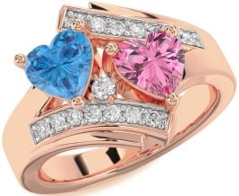 Bold and elegant, this double-heart Promise ring features two striking heart-shaped stones cradled between parallel rows of shimmering accent gems. The geometric setting adds a modern edge, while a round center stone anchors the composition with refined brilliance. The layered band design conveys strength and depth, making this piece a captivating symbol of unity and enduring affection.