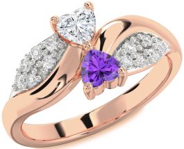 This romantic promise ring showcases two heart-shaped gemstones—one sparkling white and one vibrant purple—nestled side by side in a symbolic embrace of love and connection. Set in radiant yellow gold, the design is accented by clusters of round brilliant diamonds on each shoulder, creating a shimmering backdrop. A perfect promise ring to represent shared affection and enduring devotion.