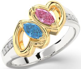 This charming gold Promise ring showcases two marquise-cut gemstones—one radiant pink and the other passionate red—cradled within open heart-shaped frames. Set side by side in a mirror-like embrace, they symbolize love and connection. A row of glistening round diamonds on each shoulder adds a touch of brilliance, creating a design that's romantic, elegant, and deeply meaningful.