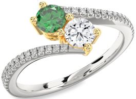 This graceful promise ring features a classic bypass design, crowned with two radiant round-cut stones—one a brilliant green and the other a dazzling white. The gently curving yellow gold band is lined with sparkling accent diamonds, enhancing its romantic symmetry. A beautiful expression of connection and commitment, this ring symbolizes unity in love.