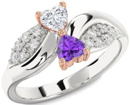 This romantic promise ring showcases two heart-shaped gemstones—one sparkling white and one vibrant purple—nestled side by side in a symbolic embrace of love and connection. Set in radiant yellow gold, the design is accented by clusters of round brilliant diamonds on each shoulder, creating a shimmering backdrop. A perfect promise ring to represent shared affection and enduring devotion.