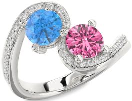 This elegant promise ring features a captivating bypass design, adorned with two brilliant round stones—one in a vibrant blue and the other in a romantic pink. Delicate white accent stones trace the sweeping curves of the polished gold band, adding shimmering detail and dimension. Symbolizing unity and everlasting love, this promise ring is the perfect expression of a heartfelt commitment.