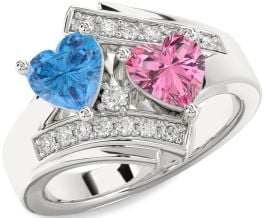Bold and elegant, this double-heart Promise ring features two striking heart-shaped stones cradled between parallel rows of shimmering accent gems. The geometric setting adds a modern edge, while a round center stone anchors the composition with refined brilliance. The layered band design conveys strength and depth, making this piece a captivating symbol of unity and enduring affection.