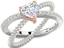 Boldly modern yet beautifully romantic, this engagement ring features a heart-shaped centerpiece perched between two contrasting bands—one shimmering with brilliance, the other sculpted in a twisted rope design. Their crossing paths create a striking sense of motion and unity. A celebration of individuality and connection, this ring embodies love with a contemporary twist.