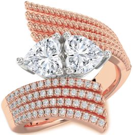 This lavish Promise Ring commands attention with two heart-shaped center stones embraced by a bold, contemporary design. One side of the band features twisted gold ropes, while the other showcases five rows of glittering pavé-set accent stones. The contrasting textures create dynamic visual movement, making this piece a perfect blend of romance and sophistication.