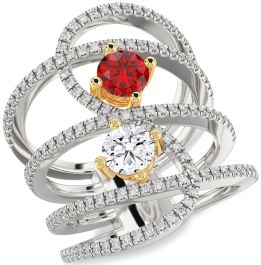 This bold and glamorous promise ring features a dramatic openwork spiral design in gleaming yellow gold, encrusted with rows of sparkling pavé-set diamonds that swirl around two brilliant round stones—one fiery red, the other radiant white. Symbolizing a passionate connection and everlasting love, this unique ring is a statement of devotion and personal style.