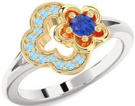 Blue Sapphire & Aquamarine White Yellow Gold Flower Round Promise Ring