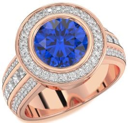 Diamond Blue Sapphire Rose Gold Round Halo Pave Engagement Ring
