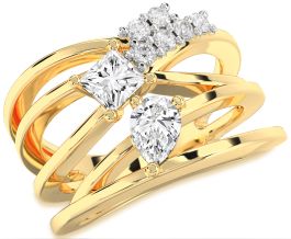 This exquisite Promise ring radiates modern elegance with its intricate multi-band design in polished yellow gold. It showcases a captivating square-cut pink gemstone and a brilliant pear-cut white stone, both securely prong-set for maximum sparkle. A cascade of round accent diamonds crowns the top, adding extra shimmer and luxury. This ring symbolizes love, unity, and timeless commitment.