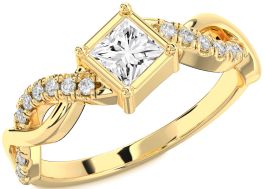 This exquisite promise ring features a dazzling square cluster of princess-cut diamonds at its center, creating a brilliant focal point. The yellow gold band is intricately designed with a crossover motif, adorned with a trail of round-cut diamonds that shimmer with every movement. A symbol of love, loyalty, and shared dreams, this promise ring radiates elegance and timeless charm.