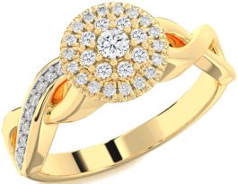 This Promise ring showcases a dazzling halo design, featuring a round center diamond surrounded by two radiant tiers of brilliant accent stones. The intricate cluster is framed with fine milgrain detailing, while the split yellow gold band is accented with pavé-set diamonds, creating a timeless and eye-catching expression of lasting devotion and elegance.