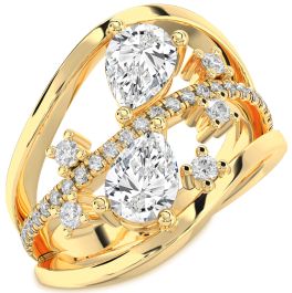 Celebrate love and elegance with this stunning promise ring featuring two pear-shaped stones—one a vibrant pink and the other a sparkling white—gracefully set on a luxurious yellow gold band. The split shank is accented with shimmering pavé diamonds and delicate starburst-style diamond clusters, adding extra brilliance. A perfect symbol of enduring commitment and shared dreams.