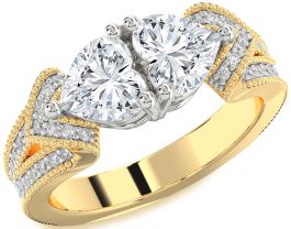 This Promise ring features two heart-shaped center stones nestled together in a side-by-side setting, symbolizing unity and lasting affection. The band is beautifully adorned with intricate pave-set accents and beaded milgrain detailing that frame the hearts with elegance. The elaborate design and craftsmanship make it a timeless statement of deep love and enduring devotion.