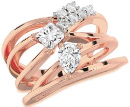 This exquisite Promise ring radiates modern elegance with its intricate multi-band design in polished yellow gold. It showcases a captivating square-cut pink gemstone and a brilliant pear-cut white stone, both securely prong-set for maximum sparkle. A cascade of round accent diamonds crowns the top, adding extra shimmer and luxury. This ring symbolizes love, unity, and timeless commitment.