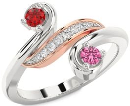 This graceful promise ring showcases a swirling yellow gold band that embraces two radiant round stones—one brilliant blue and one vivid pink. A sleek channel of shimmering white stones flows between the curves, adding sparkle and sophistication. Symbolizing a deep and colorful bond, this promise ring is a heartfelt tribute to unity, love, and lasting devotion.