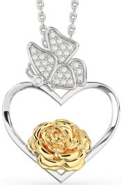 Diamond Silver & 10K gold Heart Flower Butterfly Necklace