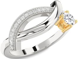 This Promise ring features a distinctive contemporary design, with a polished yellow gold band that curves upward into a marquise-like frame. A row of pavé-set diamonds is bordered by delicate milgrain accents, adding vintage charm. The brilliant round-cut center diamond is secured in a four-prong setting, making this Promise ring a bold symbol of love and commitment.
