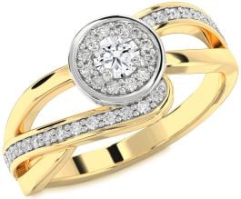 This Promise ring features a dazzling round-cut center diamond encircled by a brilliant halo of smaller diamonds, creating a radiant focal point. The unique split shank design, adorned with two parallel rows of pavé-set diamonds, adds depth and dimension. Crafted in luxurious yellow gold, it’s a captivating symbol of enduring commitment and heartfelt promises.