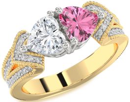 This Promise ring features two heart-shaped center stones nestled together in a side-by-side setting, symbolizing unity and lasting affection. The band is beautifully adorned with intricate pave-set accents and beaded milgrain detailing that frame the hearts with elegance. The elaborate design and craftsmanship make it a timeless statement of deep love and enduring devotion.