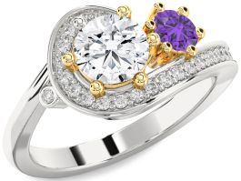 This exquisite promise ring showcases a dazzling duo of round-cut stones—one radiant white and the other a regal purple—set in an elegant bypass design. A halo of sparkling accents surrounds the larger center stone, while the polished gold band is lined with additional white gems for extra brilliance. Thoughtfully crafted, this ring is a heartfelt symbol of enduring love and devotion.