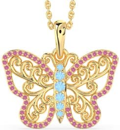 Large Aquamarine & Pink Sapphire Gold Silver Butterfly Necklace