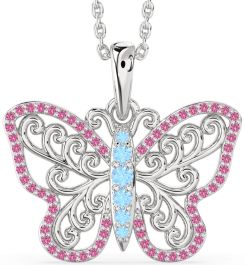 Large Aquamarine & Pink Sapphire Silver Butterfly Necklace