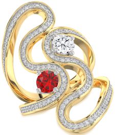 This exquisite promise ring features a breathtaking swirl design in gleaming yellow gold, elegantly paved with shimmering accent diamonds throughout. Two prominent round stones—one icy blue and the other clear—are securely held in classic four-prong settings at the heart of the sweeping curves. A graceful and artistic expression of lasting commitment, this promise ring radiates beauty and romance.
