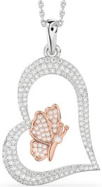 Large Diamond Silver & 10K Rose Gold Heart Butterfly Necklace