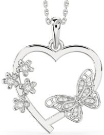 Large Diamond Silver Heart Flower Butterfly Necklace